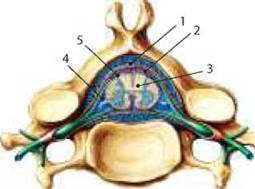 Іл. 81. Розташування спинного мозку в каналі хребта: 1 - тверда оболонка; 2 - павутинна оболонка; 3 - спинний мозок; 4 - спинномозкова рідина;