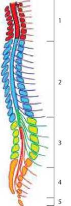 Спинний мозок складається з 31 сегмента, об’єднаних у відділи: шийний (8 сегментів), грудний (12 сегментів), поперековий (5 сегментів), крижовий (5 сегментів), куприковий (1 сегмент).