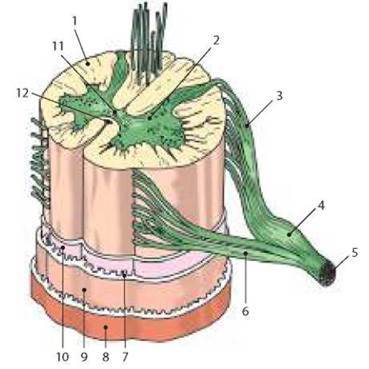 2 - сіра речовина; 3 - чутливий корінець; 4 - вузол чутливого корінця; 5 - спинномозковий нерв;