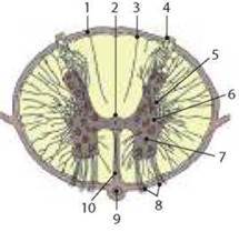 2. Розгляньте поперечний зріз спинного мозку і визначте цифри, якими позначено такі елементи внутрішньої будови: роги сірої речовини, канатики білої речовини, чутливі корінці, рухові корінці, передню борозну, задню борозну, м’яку оболонку, поперекову артерію.