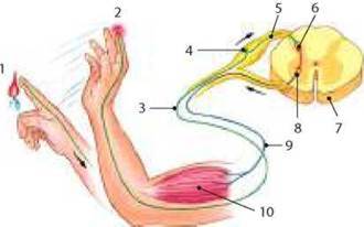 Розгляньте схему рефлекторної дуги захисного соматичного рефлексу та зіставте складові елементи із позначеннями: двоголовий м’яз плеча; вставний нейрон сірої речовини; тіло рухового нейрона сірої речовини; тіло чутливого нейрона; чутливий корінець; спинний мозок; терморецептори шкіри; подразник середовища; чутлива ланка рефлекторної дуги; рухова ланка рефлекторної дуги.