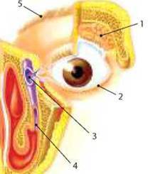 1 - слізна залоза; 2 - повіка з віями; 3 - слізний мішок;