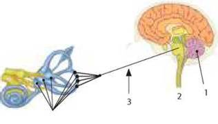 3 - вестибулярний нерв; 4 - волоскові клітини вестибулярного апарату