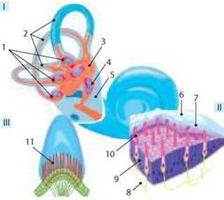 ІІ. Отолітовий апарат: 6 - отоліти; 7 - отолітова мембрана; 8 - нервові волокна; 9 - опорні клітини; 10 - волоскові клітини.