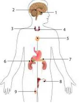 - залози внутрішньої секреції (ендокринні залози) - це залози, які виділяють гормони (інкрети) у внутрішнє середовище й не мають вивідних шляхів. До цієї групи належать гіпофіз (1), епіфіз (2), щитоподібна (3), прищитоподібні (4), вилочкова (5), надниркові залози (6);