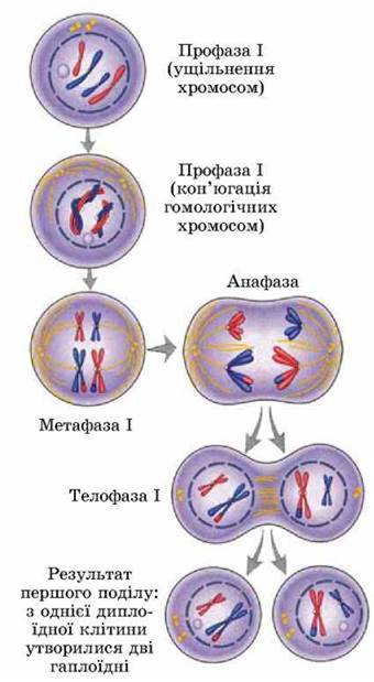 Мейоз - особливий спосіб поділу клітин еукаріотичних організмів, здатних розмножуватися статевим шляхом. Він складається з двох послідовних поділів, інтерфаза між якими вкорочена, а в деяких рослин - практично відсутня. Кожний із цих поділів, як і мітоз, складається із чотирьох послідовних фаз: профази, метафази, анафази і телофази.