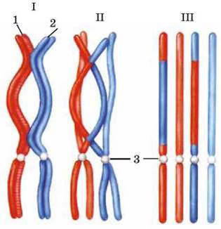 І - гомологічні хромосоми (1 та 2) зближуються, ІІ - після кон’югації гомологічні хромосоми починають розходитися (3 - центромери), але залишаються сполученими у певних ділянках, ІІІ - хроматиди гомологічних хромосом, що після кросинговеру обмінялися своїми ділянками (знайдіть ці ділянки на малюнку). Так унаслідок процесу кросинговеру утворилися дві гомологічні хромосоми з різним набором спадкової інформації