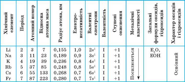 Атоми мають на зовнішньому енергетичному рівні лише один валентний електрон, відрізняються атомним радіусом, що закономірно збільшується зі зростанням атомного номера елементів. Саме тому всі ці елементи є типовими металічними елементами, в групі із зростанням атомного номера їх металічні властивості посилюються. В сполуках перебувають у вигляді однозарядних йонів. Утворюють основні оксиди Е2О, основи ЕОН, які є лугами, і гідриди ЕН.