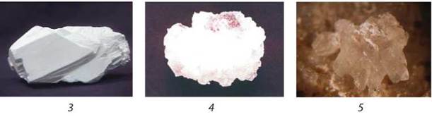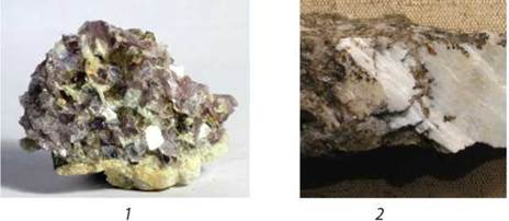 Мал. 100. Природні сполуки лужних елементів. Li: 1 — лепідоліт, 2 — сподумен;