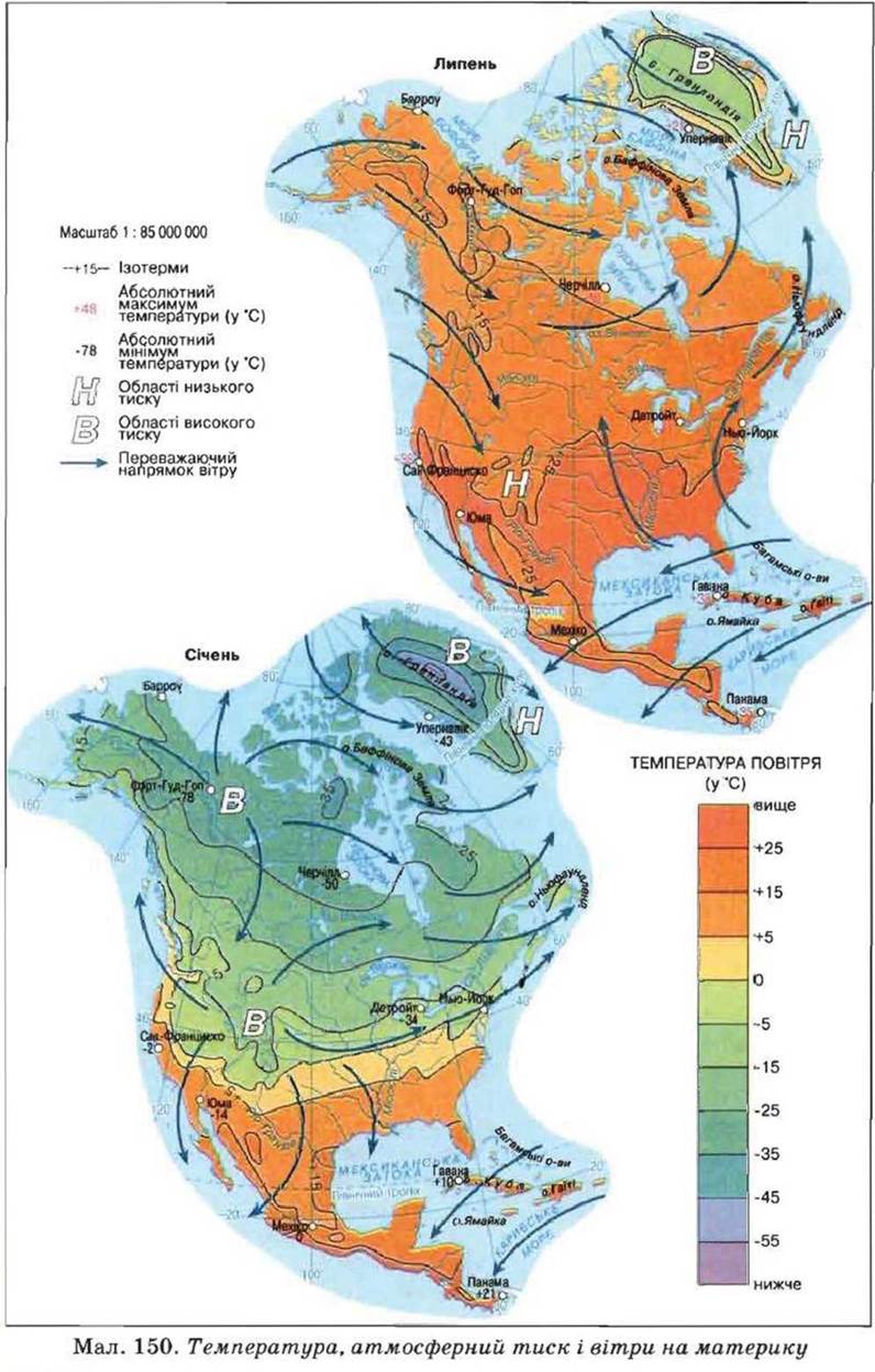 Значна різниця температур над північною та південною окраїнами материка зумовлює велику різницю атмосферного тиску і відповідний рух повітряних мас - з Північного Льодовитого океану й Мексиканської затоки в глиб континенту (мал. 150).