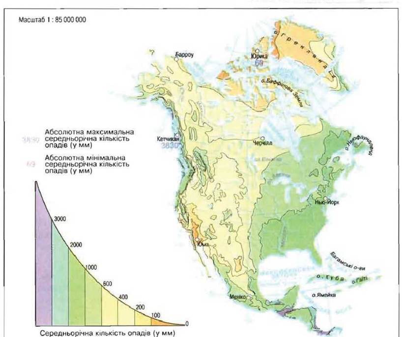 На континенті, на відміну від Південної Америки, переважає не пасатне, а західне перенесення повітряних мас. Однак серйозною перешкодою для нього є гірська система Кордильєр. Долаючи її, циклони залишають майже всю вологу на навітряних схилах. За рік тут випадає назагал 2000-3000 мм опадів. А окремим ділянкам хребтів дістається понад 6000 мм опадів. Водночас східні схили Кордильєр, а також прилеглі ділянки Великих рівнин отримують дуже мало опадів (мал. 151).