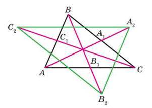 21.85. На продовженнях медіан AA1, BB1 і CC1 трикутника ABC позначили відповідно точки A2, B2 і C2 так, що A1A2 =