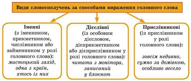 За способами вираження головного слова словосполучення поділяють на іменні, дієслівні, прислівникові.