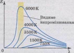 На мал. 175 наведено експериментально одержані графіки розподілу енергії Е в спектрі випромінювання вугільної спіралі при різних температурах. На осі ординат відкладені значення енергії, що відповідають даній довжині хвилі, а на осі абсцис — довжини хвиль.