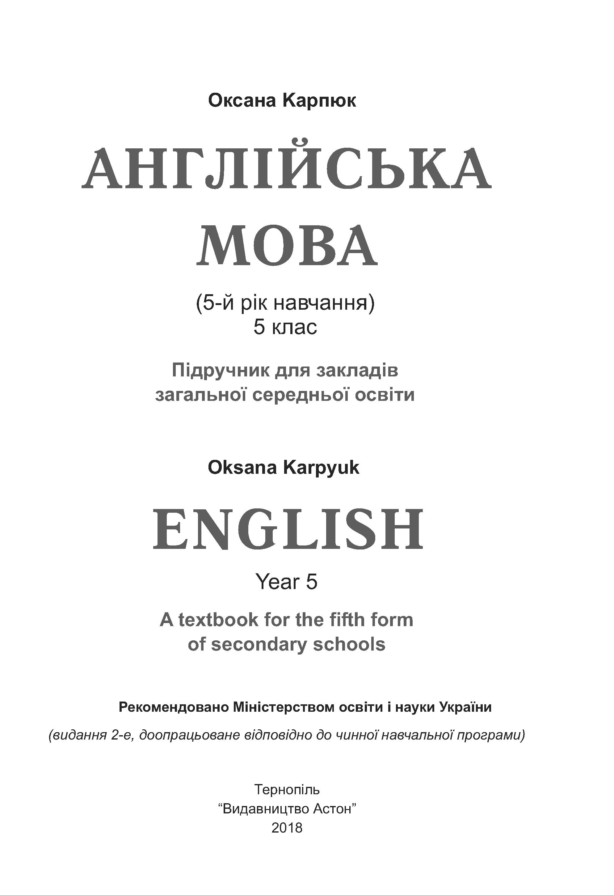 Підручники з англійської мови 5 клас Англійська мова Підручник Англійська мова 5 клас - А. М. Несвіт - Генеза 2018 - Підручник для 5 класу закладів загальної середньої освіти. Підручник Англійська мова 5 клас з поглибленим вивченням англійської мови - Л. В. Калініна - Генеза 2018 - Підручник для 5 класу закладів загальної середньої освіти. Підручник Англійська мова 5 клас - О. Д. Карп'юк - Астон 2018 - Підручник для 5 класу закладів загальної середньої освіти.